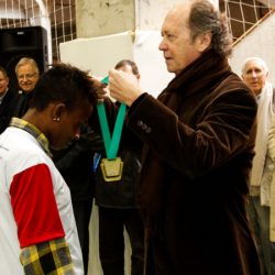 O presidente do Comitê Internacional Pierre de Coubertin, Norbert Müller, entrega a medalha comemorativa aos 150 anos de nascimento do Barão Pierre de Coubertin à Fundação Tênis. Ele visita dois núcleos em Porto Alegre. O 7º Rolando Garra conta com a participação da campeã mundial de ginástica Daiane dos Santos.